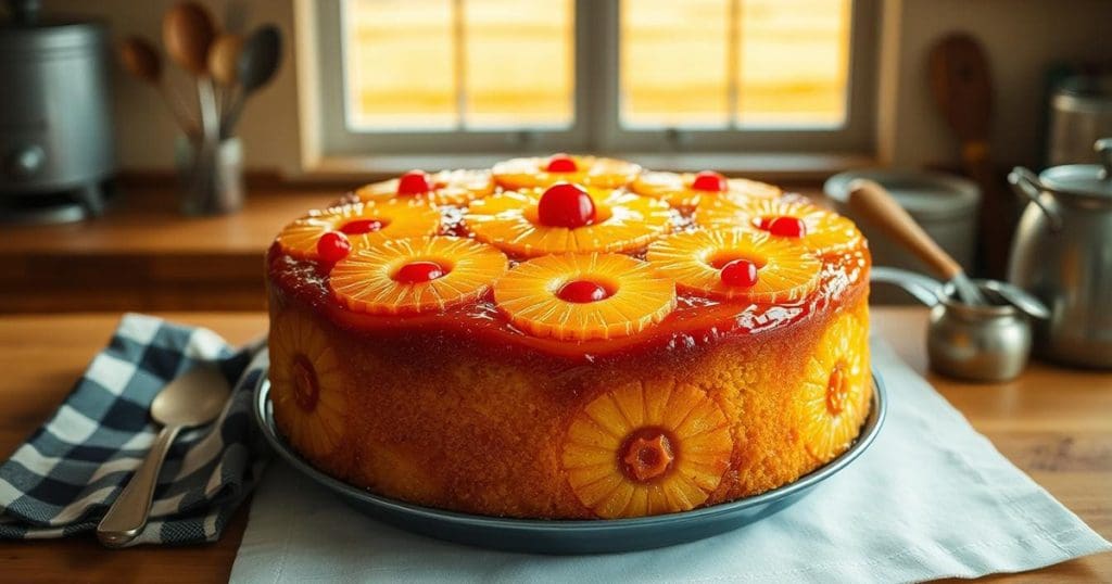 Pineapple upside-down cake has a long history, starting in the 16th and 17th centuries. Back then, pineapples were seen as a symbol of wealth. The term “upside down cake” was first used around 1870. These cakes became well-known in the mid-19th century.